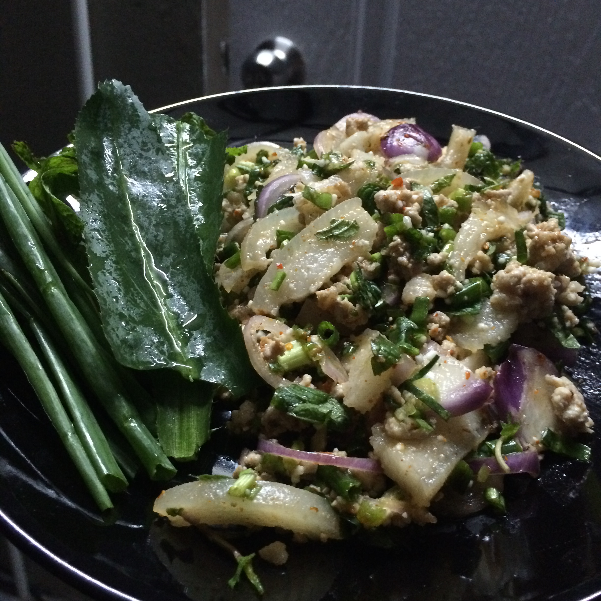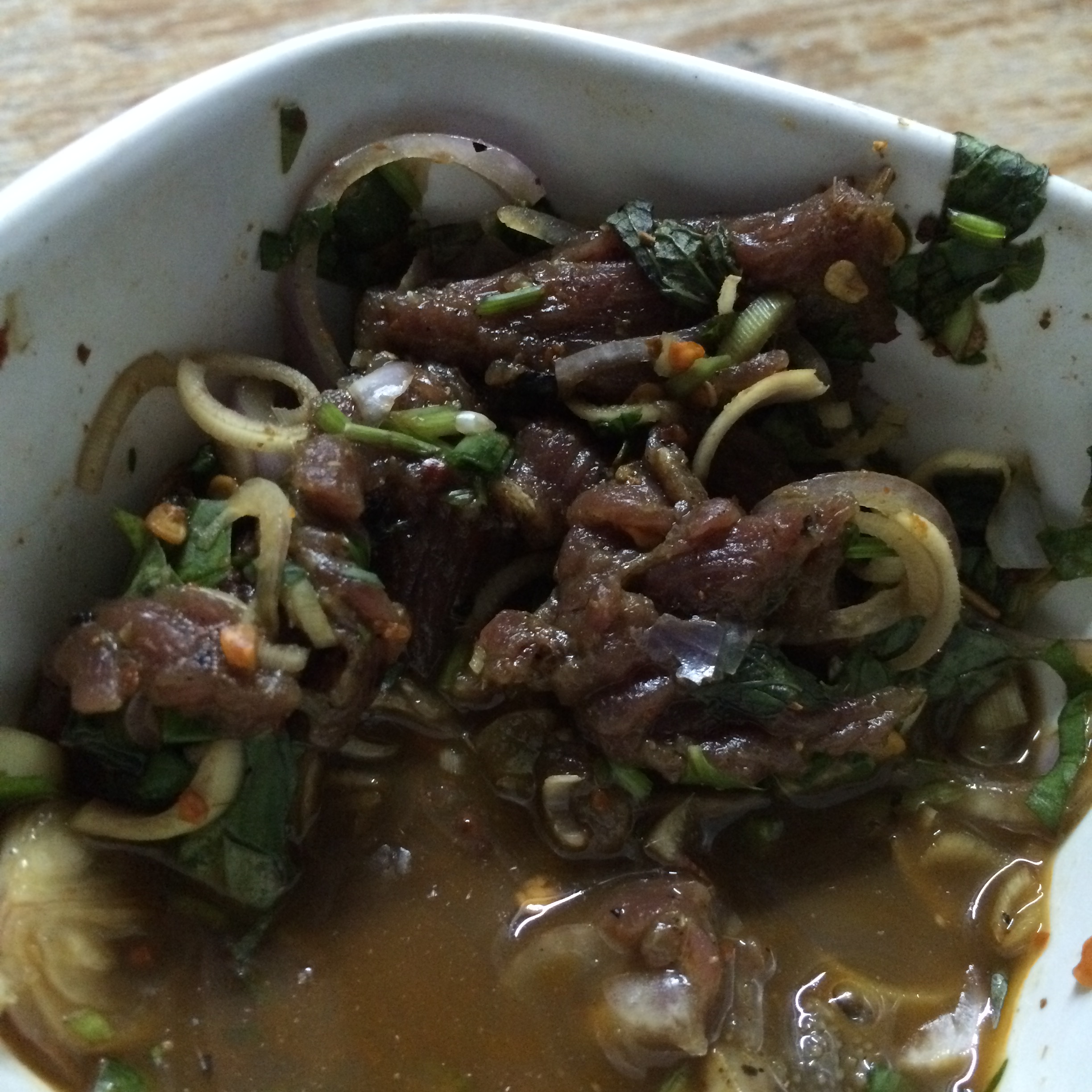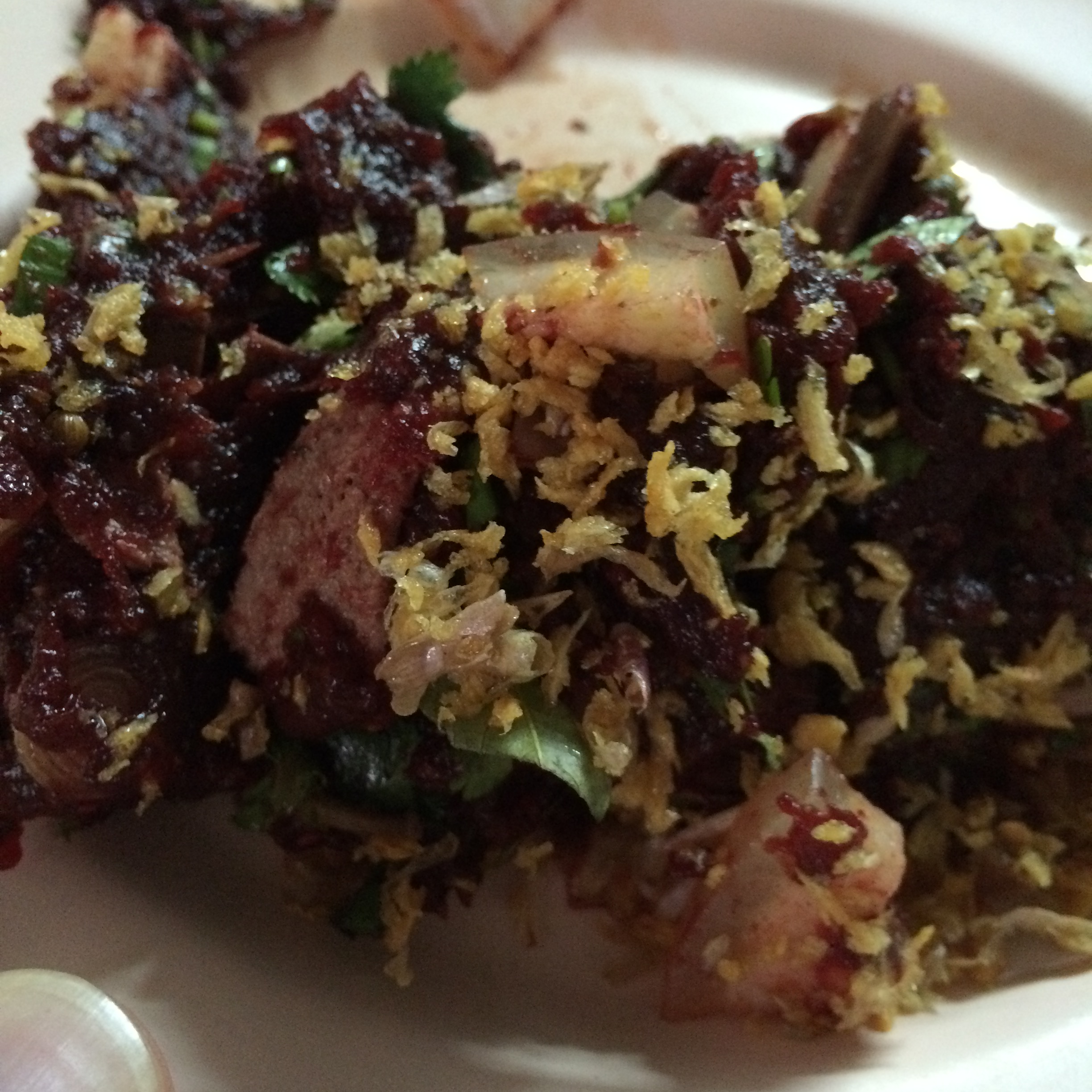Larb moo (pork tar tar in pork blood) – DELICIOUS!