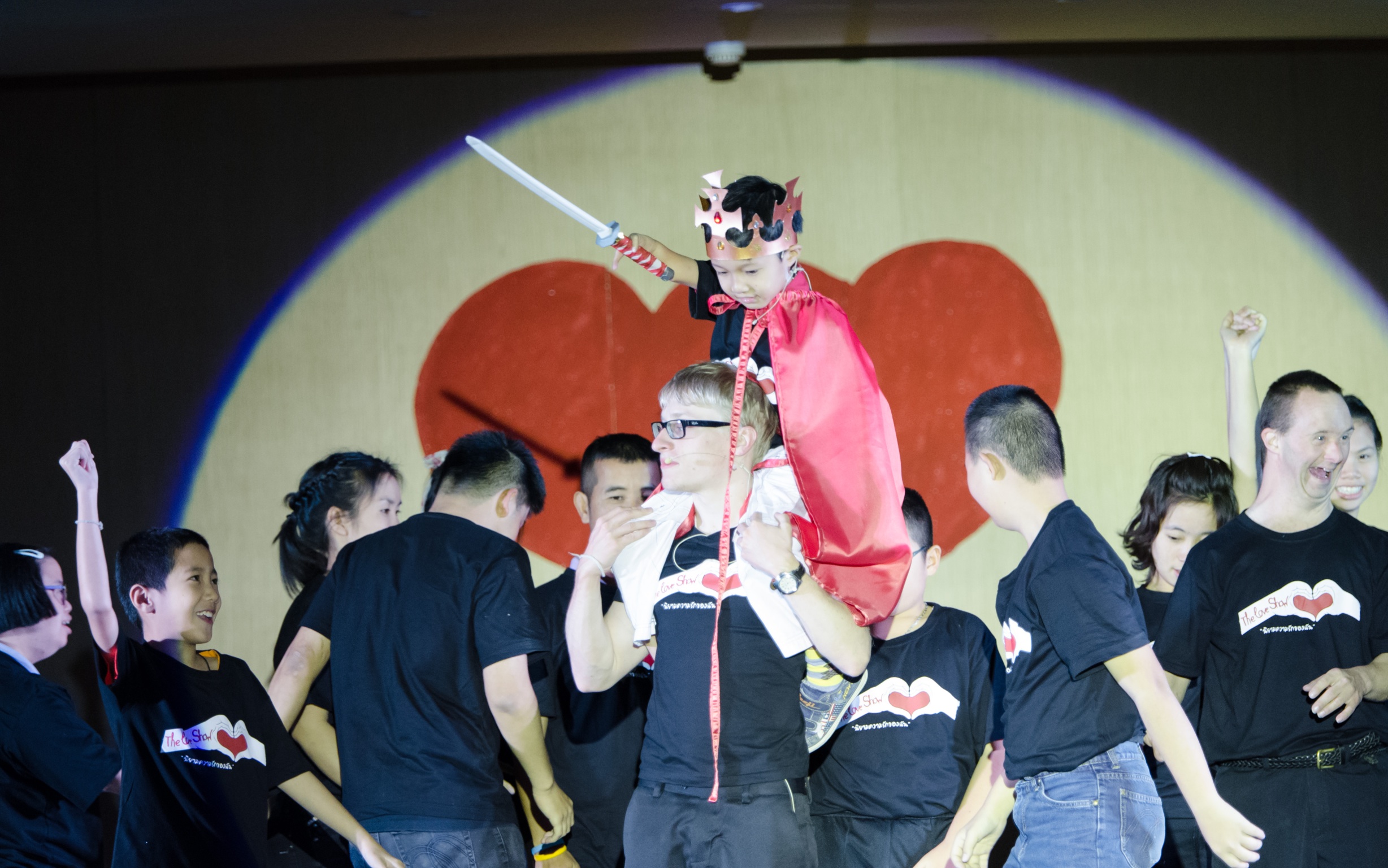 Friday, January 13 at 7pm we opened The Love Show to a huge crowd of friends, family, community and dignitaries. The audience reaction was amazing, especially to Ning Nong’s doctor sketch, Lhea’s amazing turn as Juliet (which really had me laughing from the piano), and, of course, Film, Future and Kong’s ‘Arroi! Arroi!’ rap had everyone clapping along. But it was really Aomsin as Mr. Valentine with Kevin Kling on harmonica that brought down the house. The crowd really went wild after his blues number “Mrs. Valentine” where he sings about how so many women give him attention: flowers and chocolates, but his heart belongs to Miss Thailand. Talk about a signature song – and it was entirely Pong’s idea. Way to go Pong!