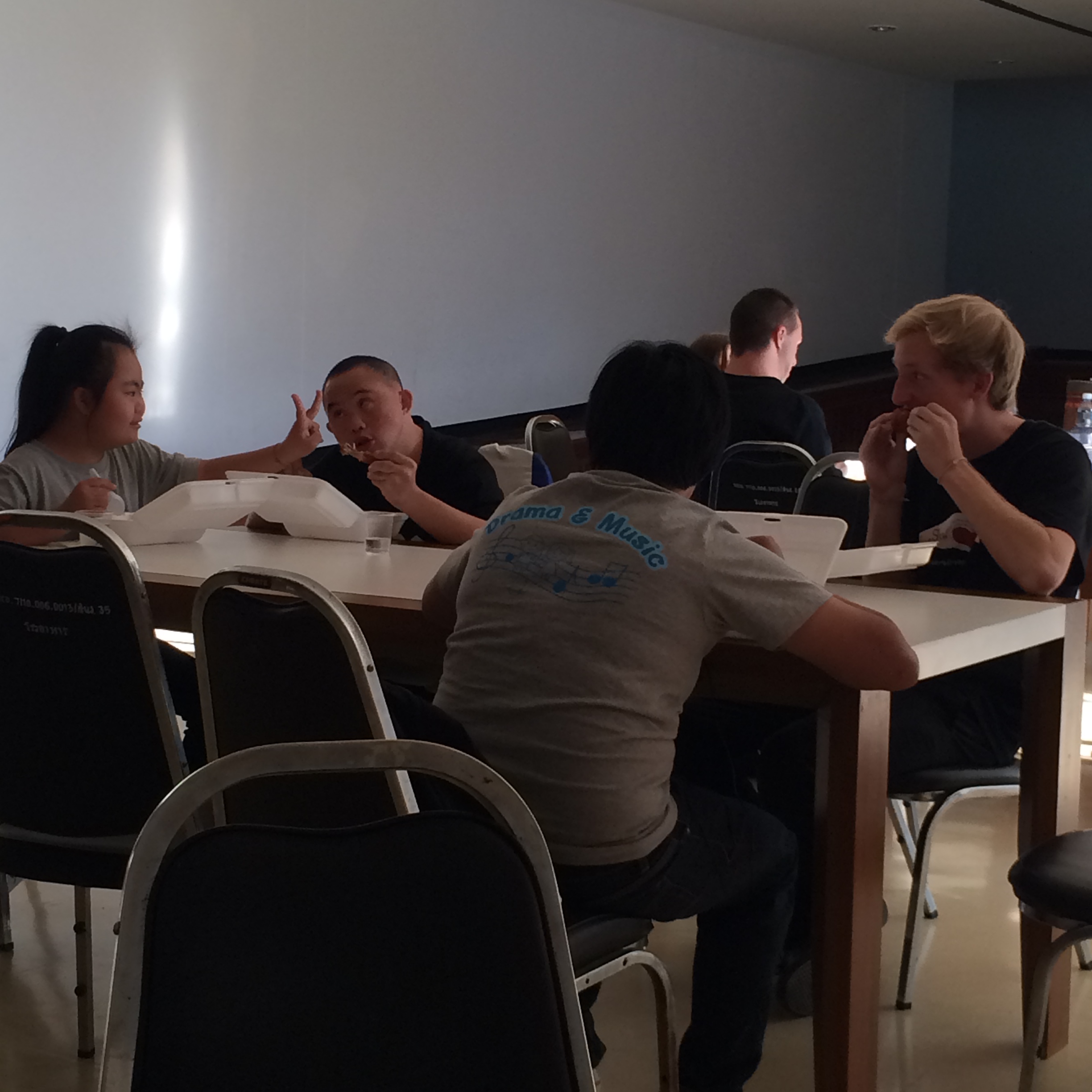 On Friday, Ryan and Co. visited RICD where the staff provided them with a generous array of Northern Thai foods including keaw gi (roasted sticky rice), ho nin gai (chicken “stew” steamed in banana leaf) and sai ooa (Northern Thia sausage). Breakfast was followed by a tour of the piano building and some shopping at the Mae Rim street market. In the afternoon, Pong and Tan taught them a part of The Dream Keeper theme in Thai and that evening we all enjoyed a traditional kantok dinner.  Everyone was very grateful they took the time to visit and explore the programs offered by RICD Drama and Music.